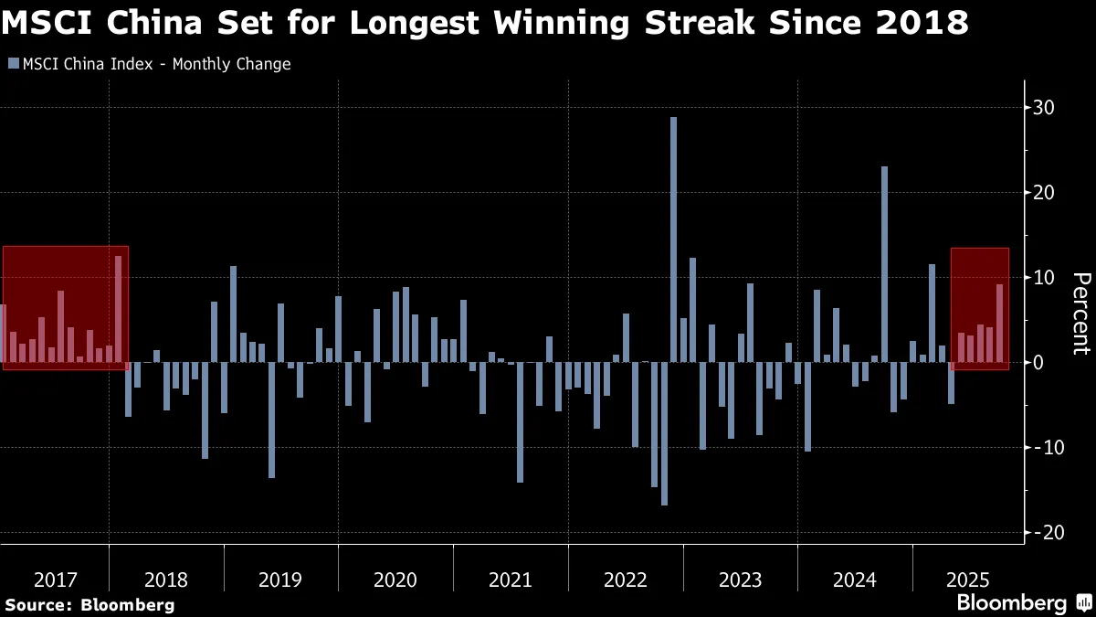 MSCI中国指数9月份上涨近9%,连续第五个月上涨。自4月份触底以来,该基准指数已上涨约40%,超过了标准普尔500指数和MSCI亚洲指数在关税引发的抛售后的反弹幅度。