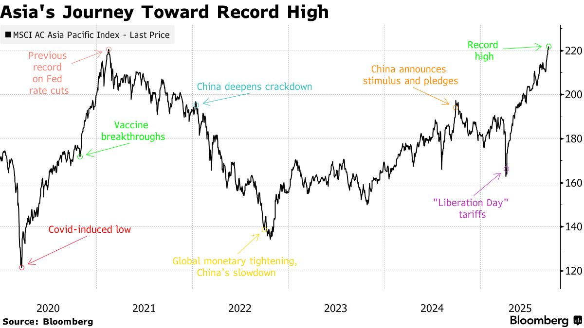 亚洲股市四年多来首次创下历史新高,对中国依赖的减少被视为支撑股市上涨持久力的基础。