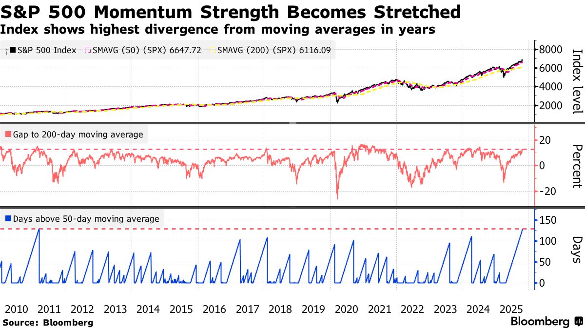 市场内部指标显示出过热迹象。标普500指数自4月以来的上涨使其与200日均线显著脱钩。10月份,该指数与200日均线的差距扩大至13%,而过去15年中,这一水平通常难以持续。