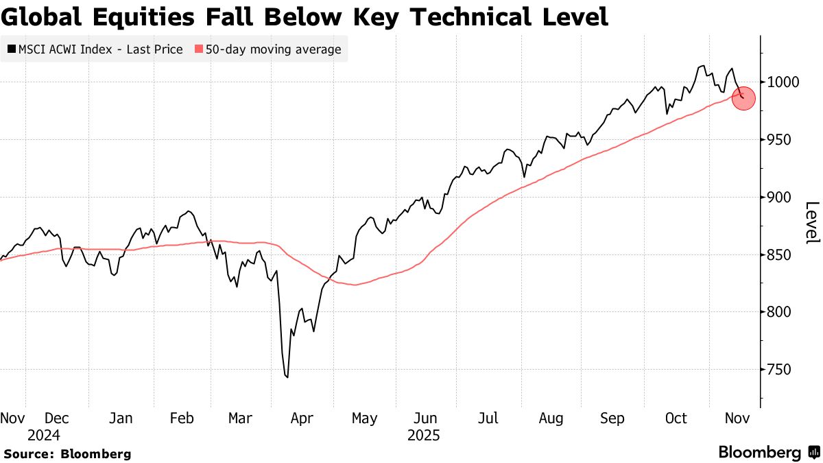 全球股市指数跌至近一个月低点,亚洲股市下跌2.1%,自4月以来首次跌破50日移动均线。一些投资者将此视为看跌信号。比特币价格跌破9万美元,进一步加剧了市场情绪。