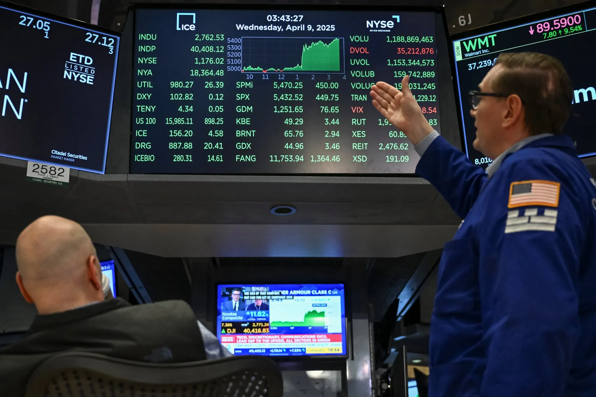 4月9日,纽约证券交易所股市一片绿色,股市应声上涨。摄影:Angela Weiss,法新社/盖蒂图片社